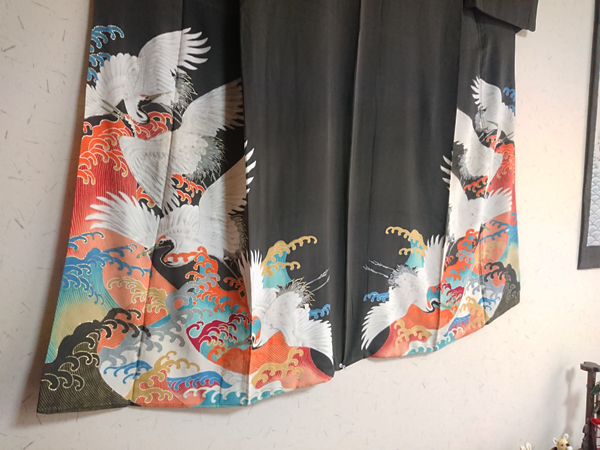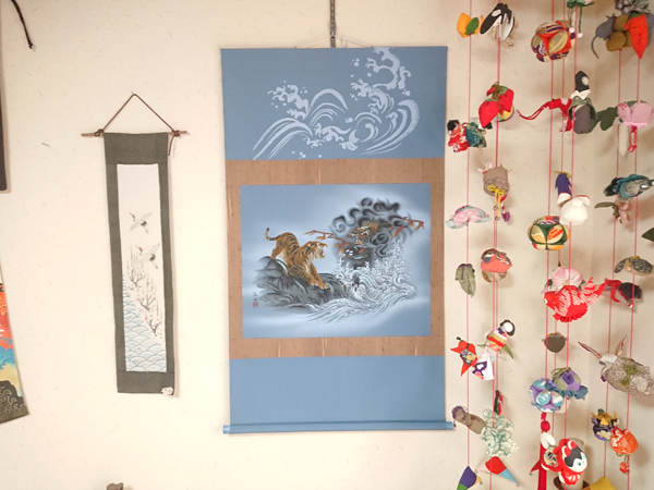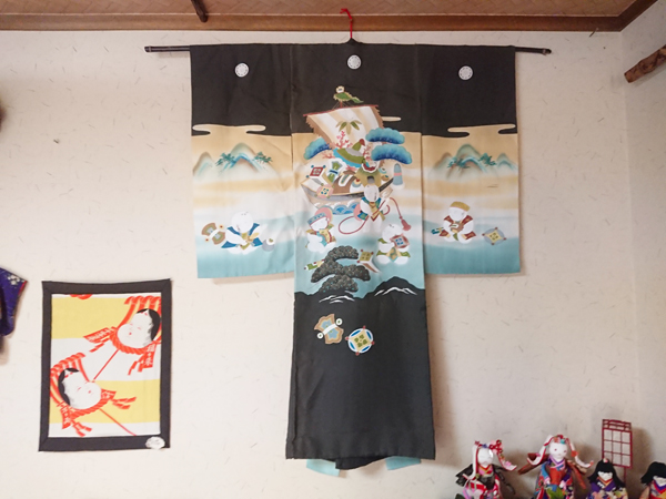 店内風景 男物の羽織りの裏を使用した山本さんの作品です。