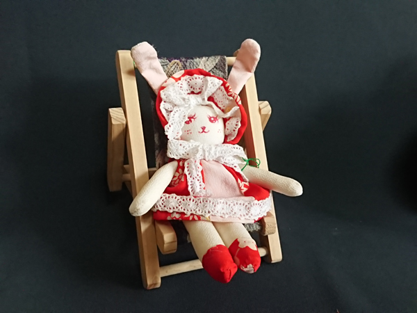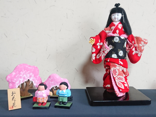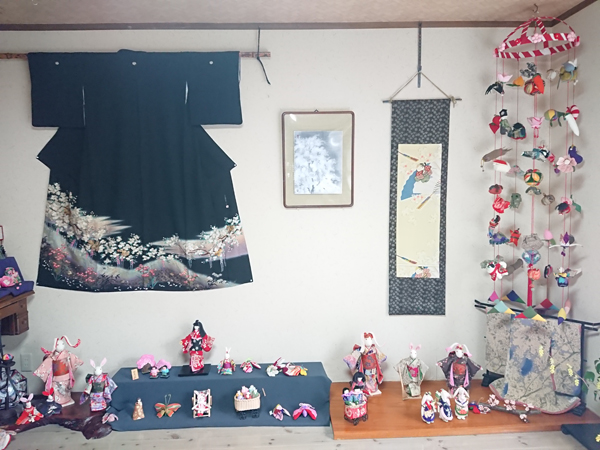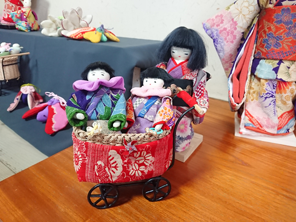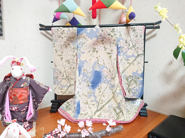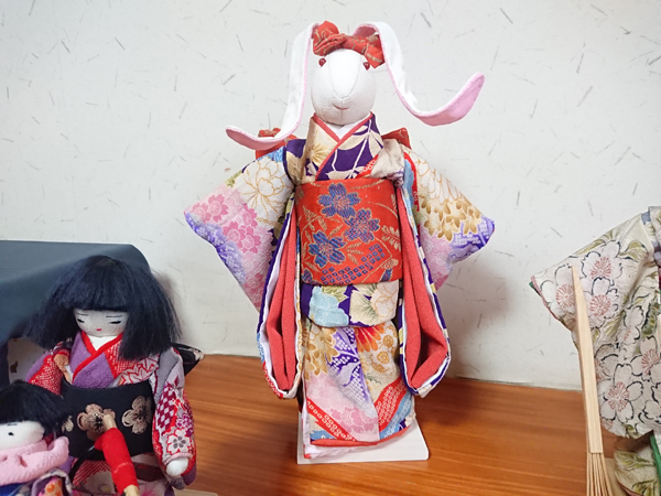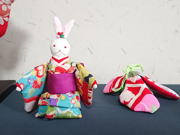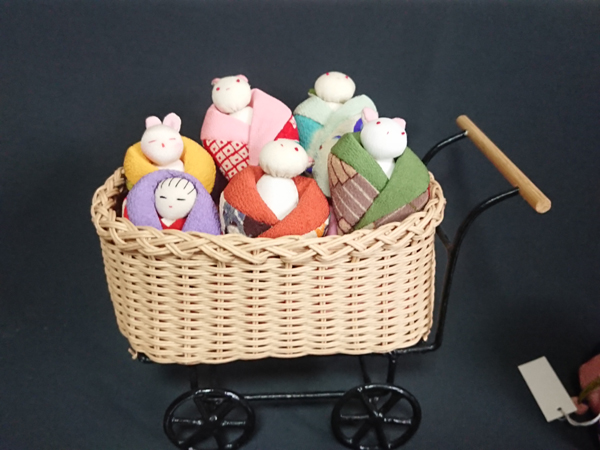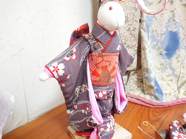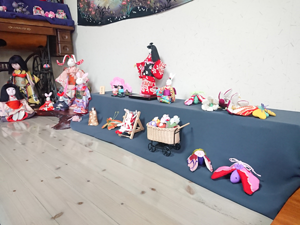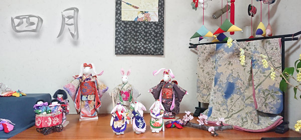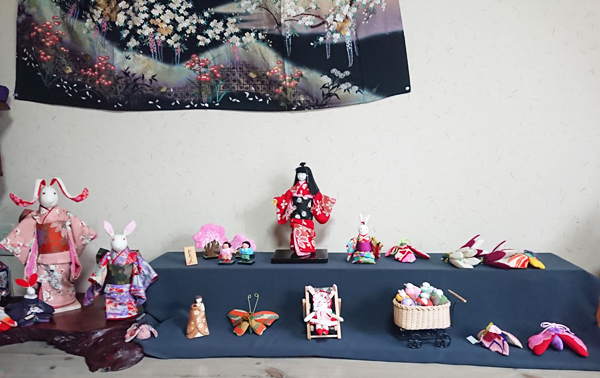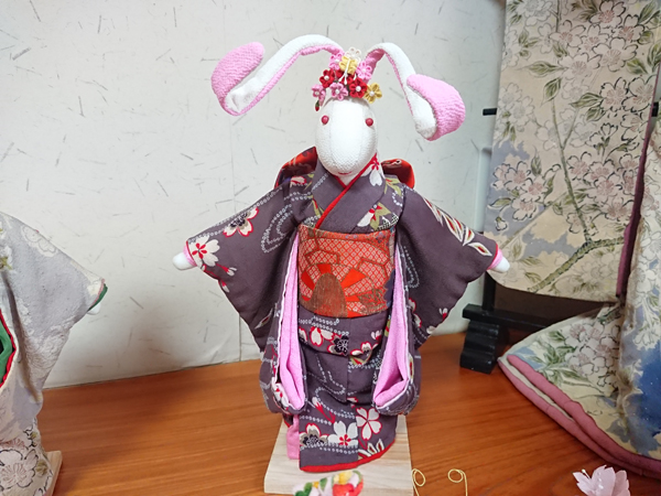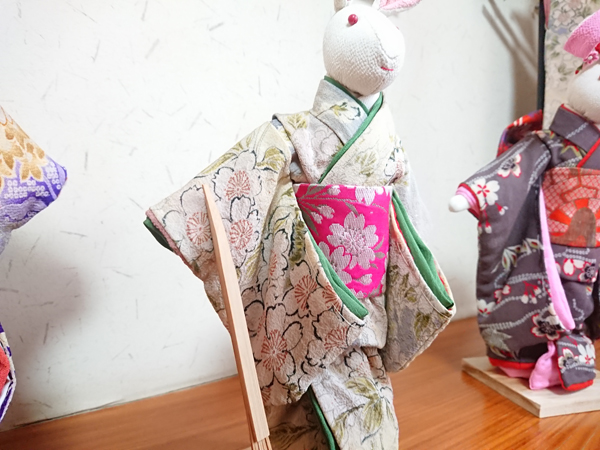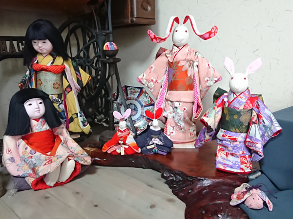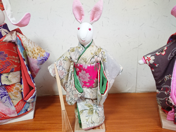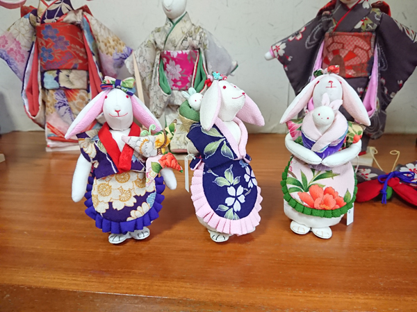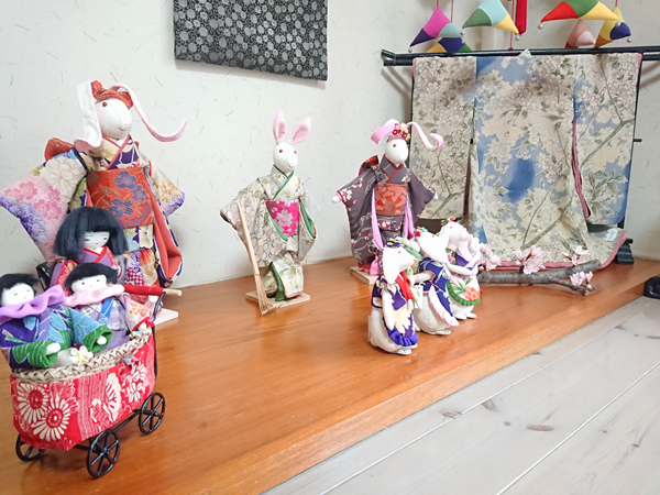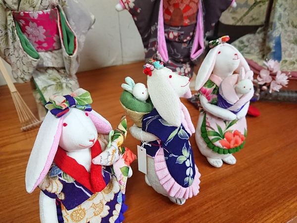 店内風景 ベスト、エプロンともに、桜柄です。おんぶうさぎに、だっこうさぎ!