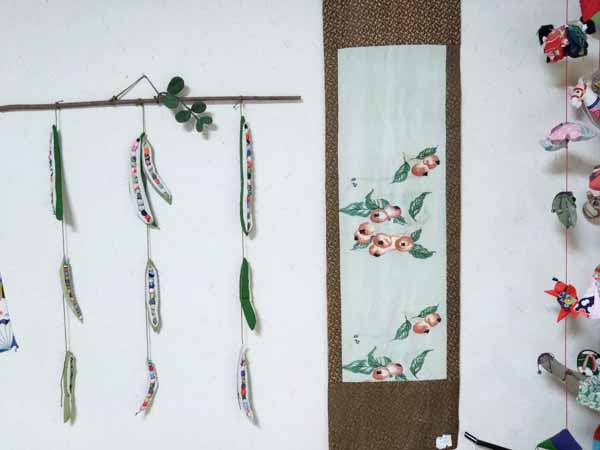 店内風景 バラの柄の飾り着物にバラ袋です。