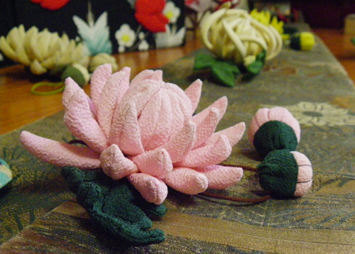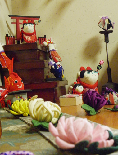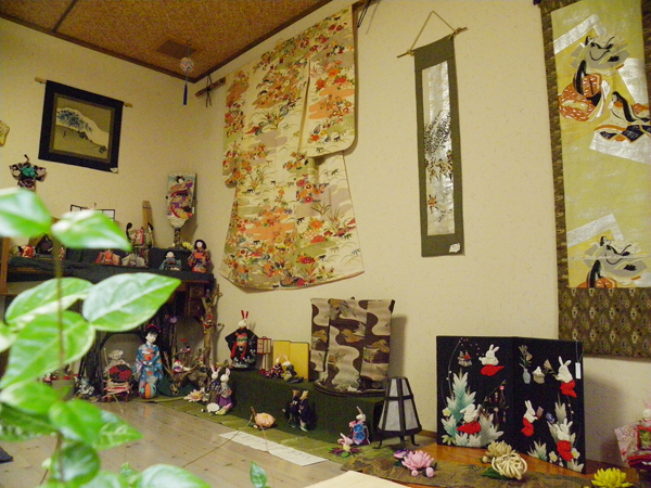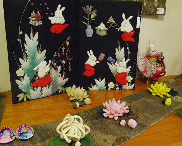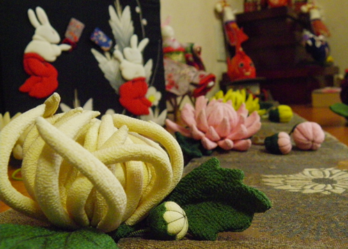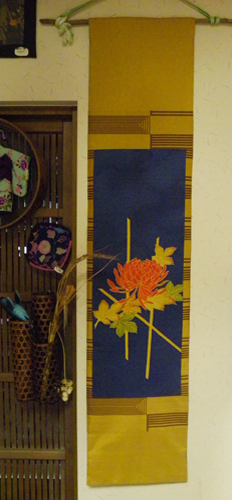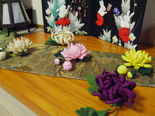 「黄、ピンク、紫、様々な色の菊を散りばめた店内」
