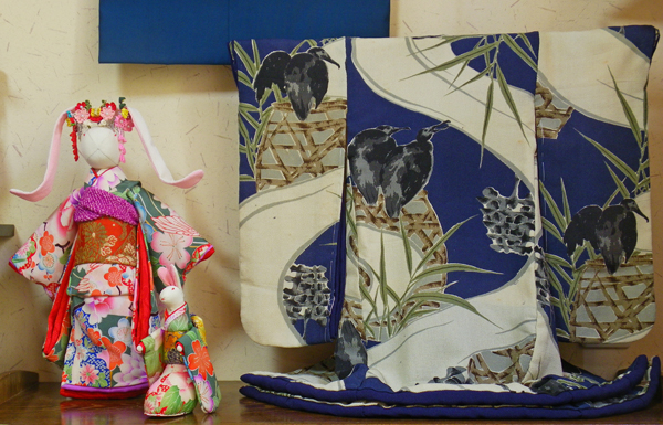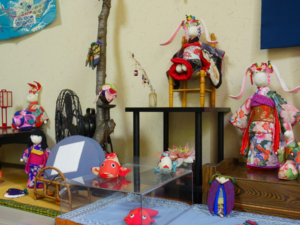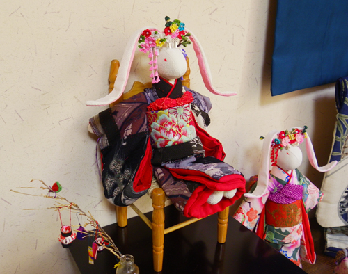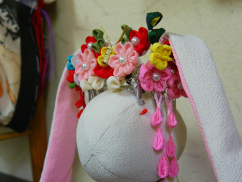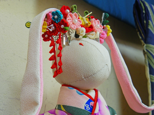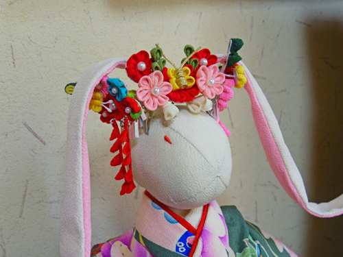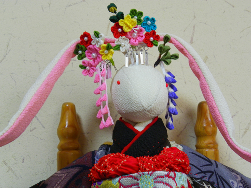 「つまみ細工」の髪飾りをつけた耳長うさぎ。