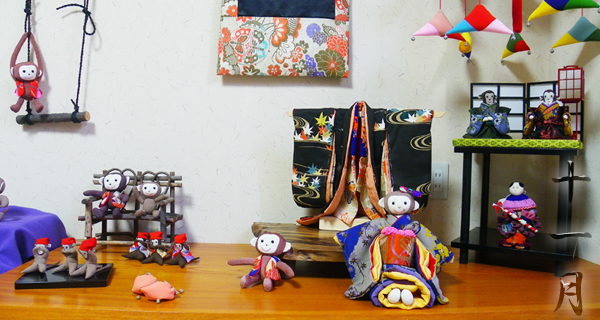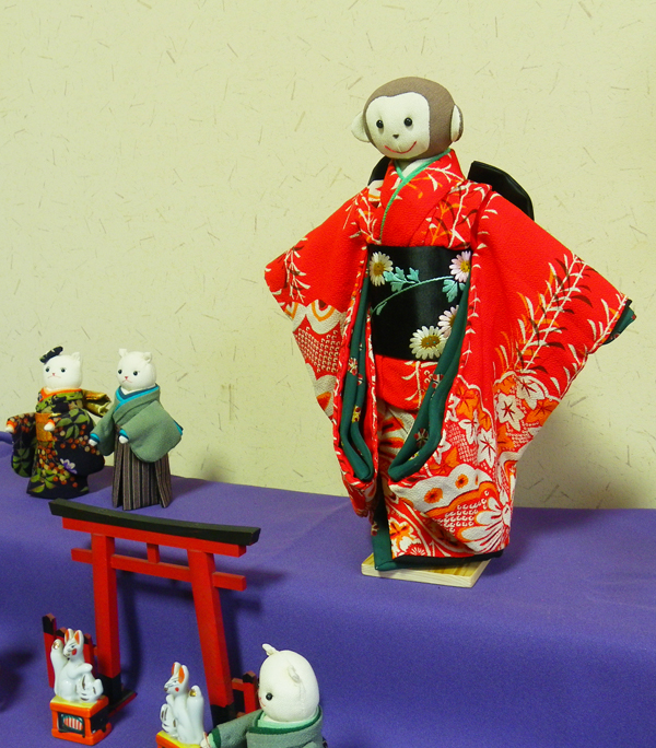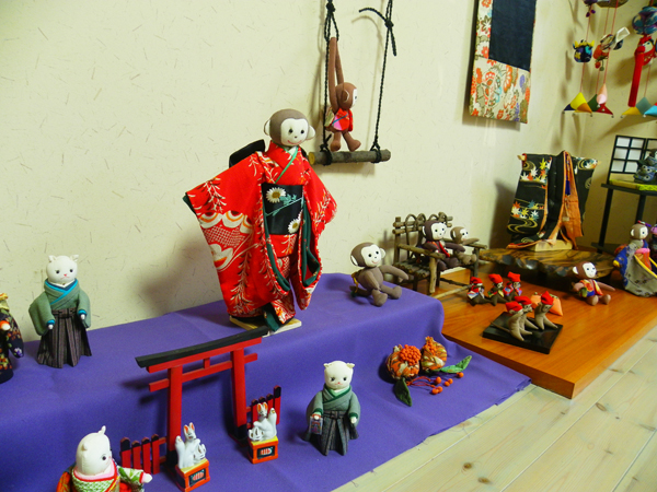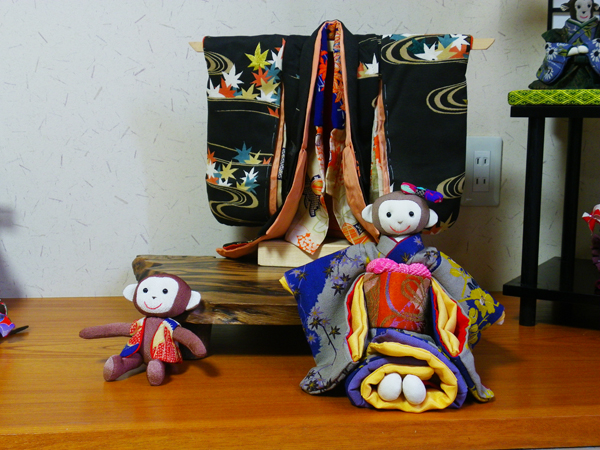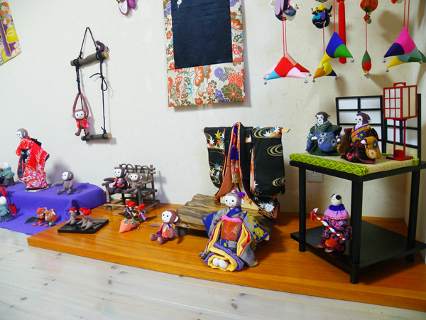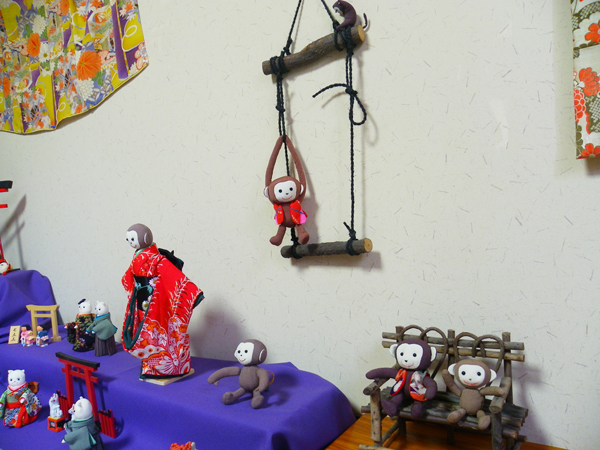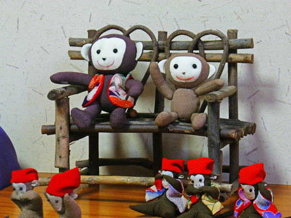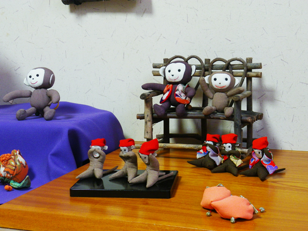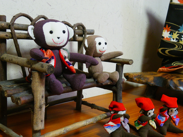 店内作品 沢山のお猿さんが集合です。一番のボスは椅子に座った着物を着ている子かな??