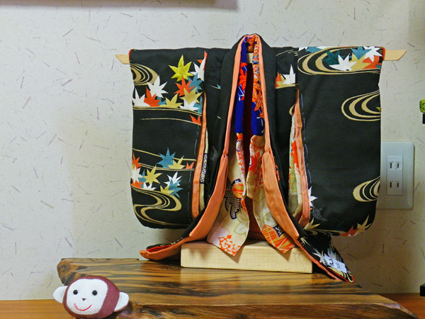 店内作品 紅葉の柄の着物をミニ着物へ…。季節に応じた短い時期にだけしか着れない贅沢な着物ですね。