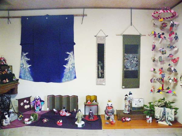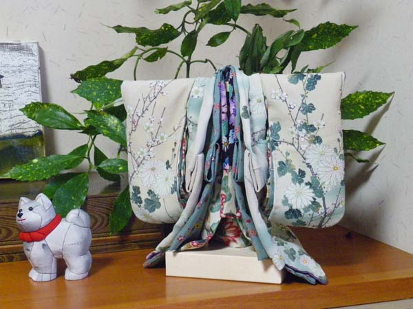 菊と梅の花が描かれた、前から眺める飾り着物。10号の人形に着せる事が出来ます!