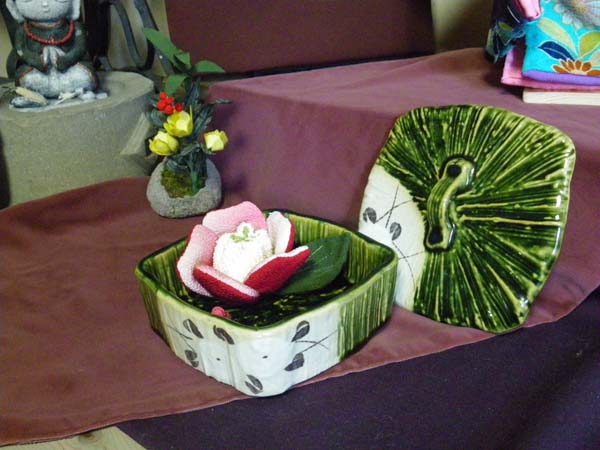 お気付きの方もいらっしゃるかもしれませんが、今月のギャラリーでは、織部焼の菓子入れを所々に飾ってみました。