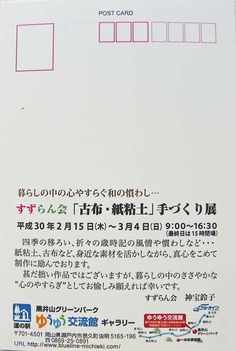 お仲間の神宝さんが開く手づくり展の紹介です。開催期間も長いので皆さん是非足をお運び下さい。