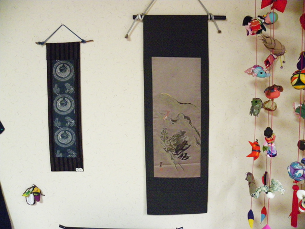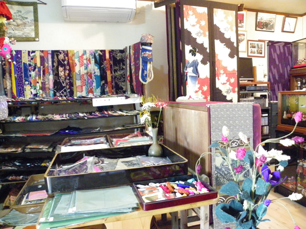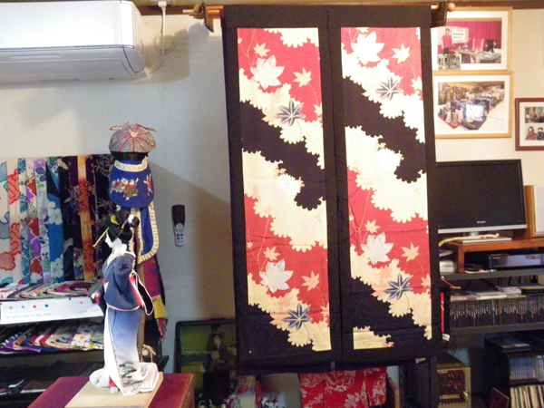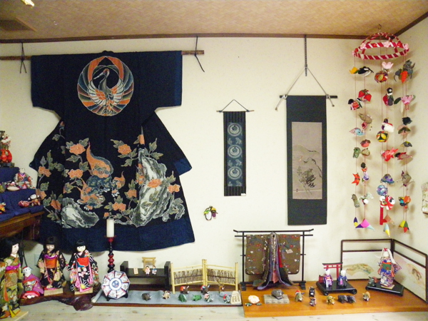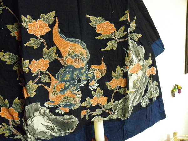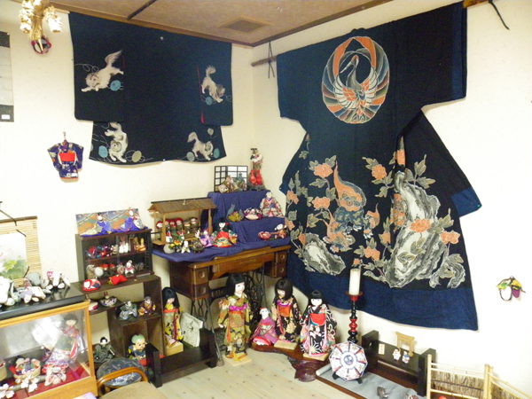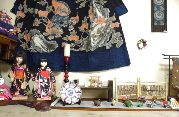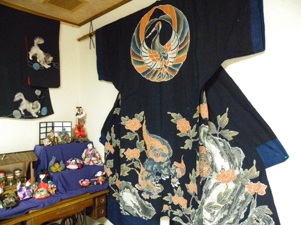 筒描き藍染の着物です。昔はあいだに綿を入れて夜着として使われていたそうです。 店内風景